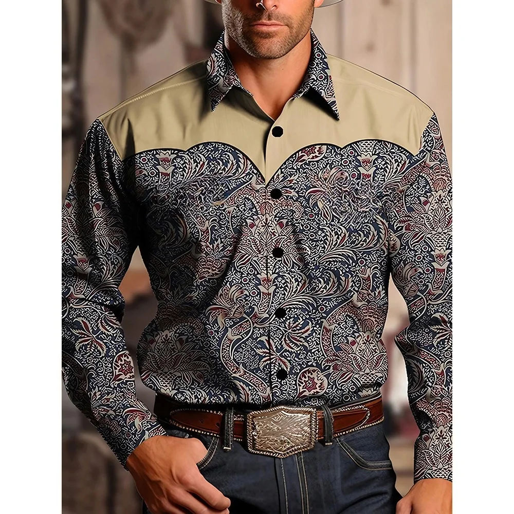 Men’s Yellowstone Western Denim Shirt Two-tone patchwork pattern Men’s roll-down button top Stylish casual long-sleeved shirt